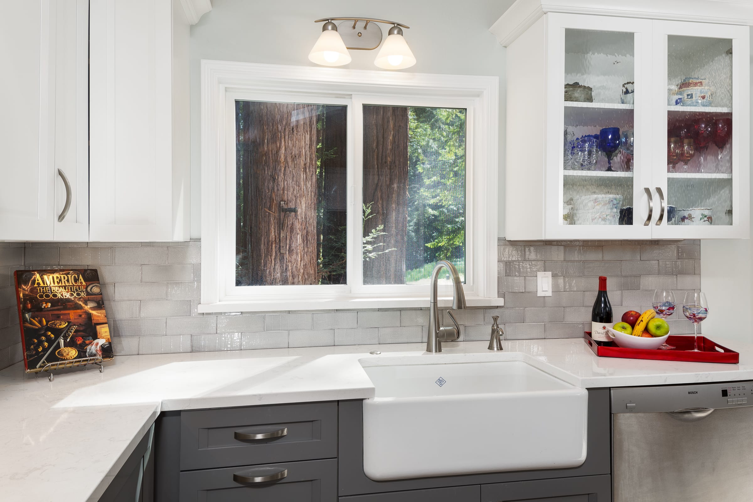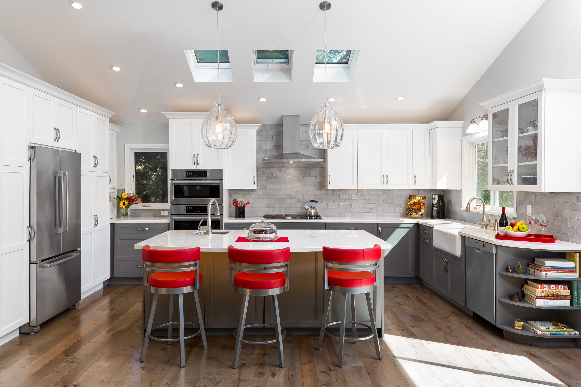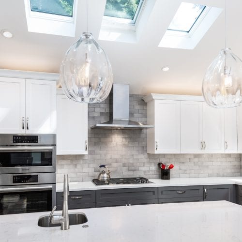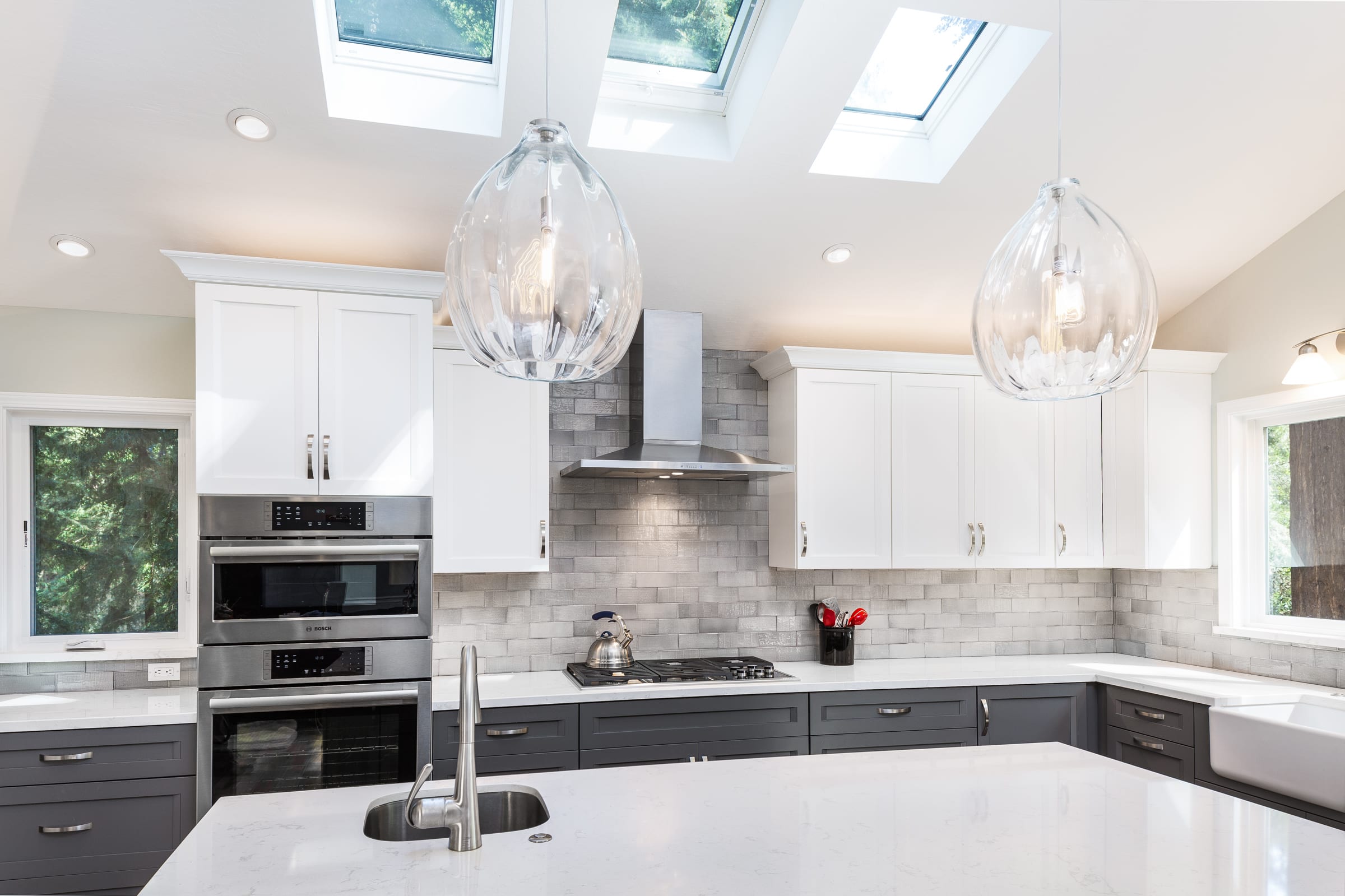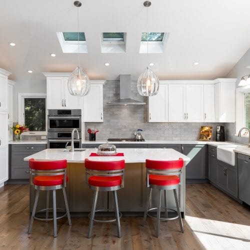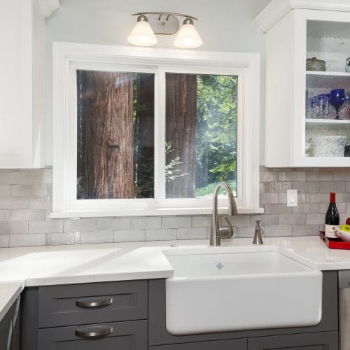 From a small, dark, U-shaped room to a bright, beautiful, expansive space, this home in the Santa Cruz Mountains houses one of our most effortlessly elegant kitchens to date. In the center of the room sits a tastefully large island for food prep, socializing, and storage. The two-toned cabinets — pristine white and classy gray — add a sophisticated touch that brightens up the room, too. During the kitchen remodel, we made it a point that functionality was never compromised; the cabinets, just like the island, are both pretty and practical. And for the finishing touch; pendants over the kitchen island. With a kitchen this sparkly, shimmery, and elegant, spending time in it is truly a joy.