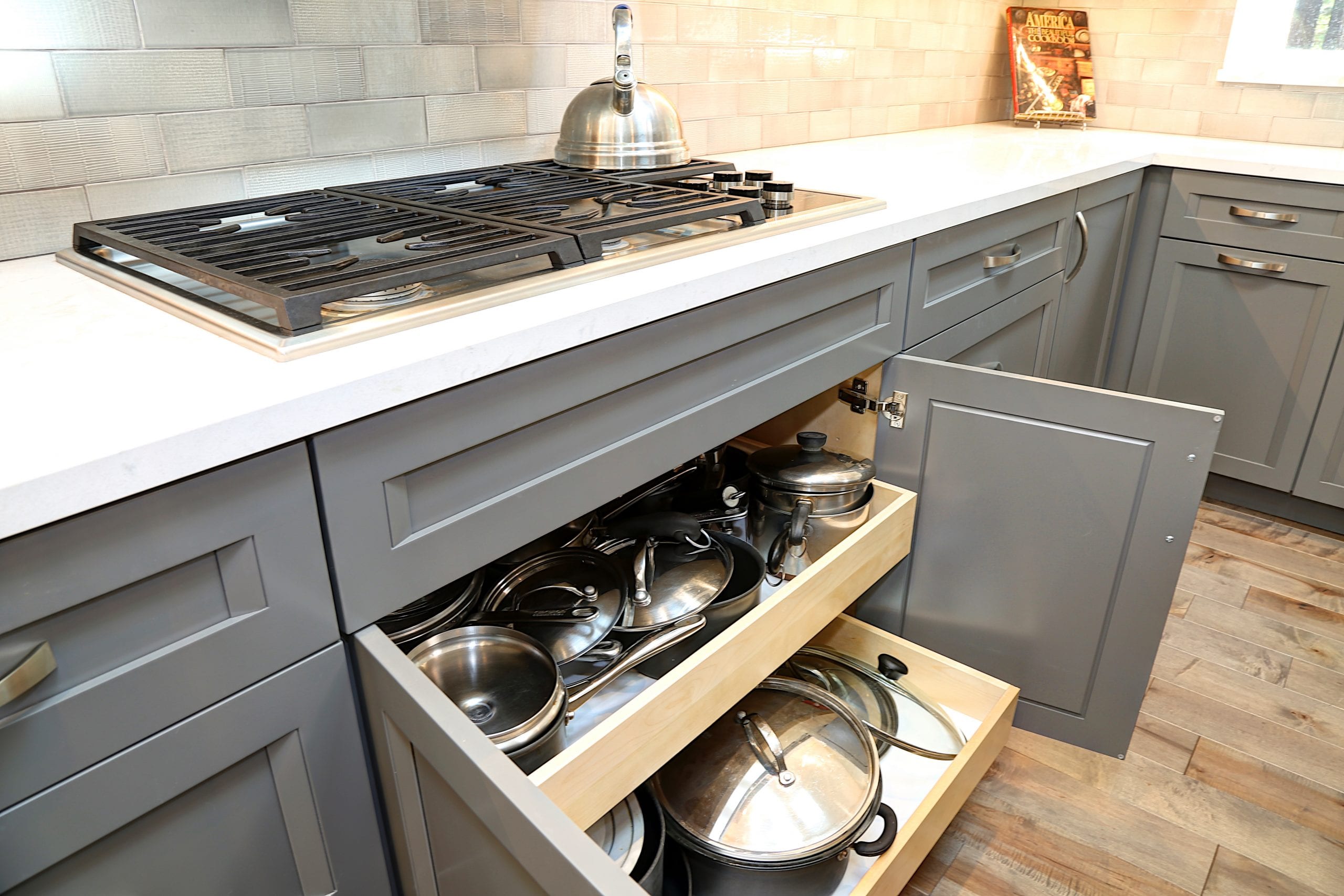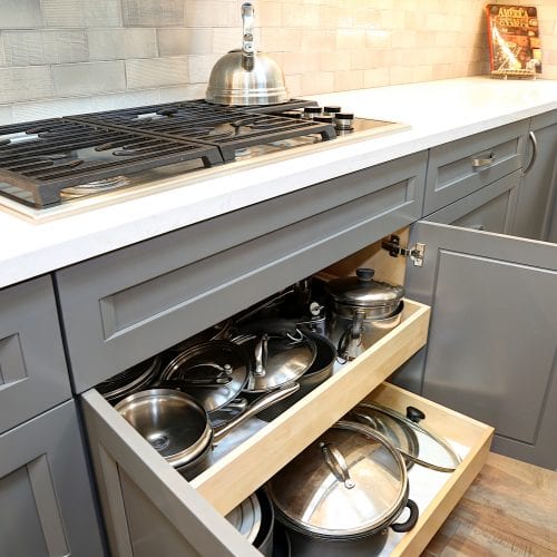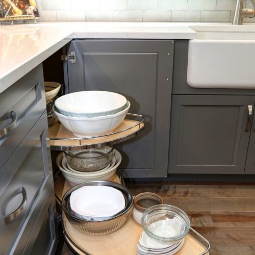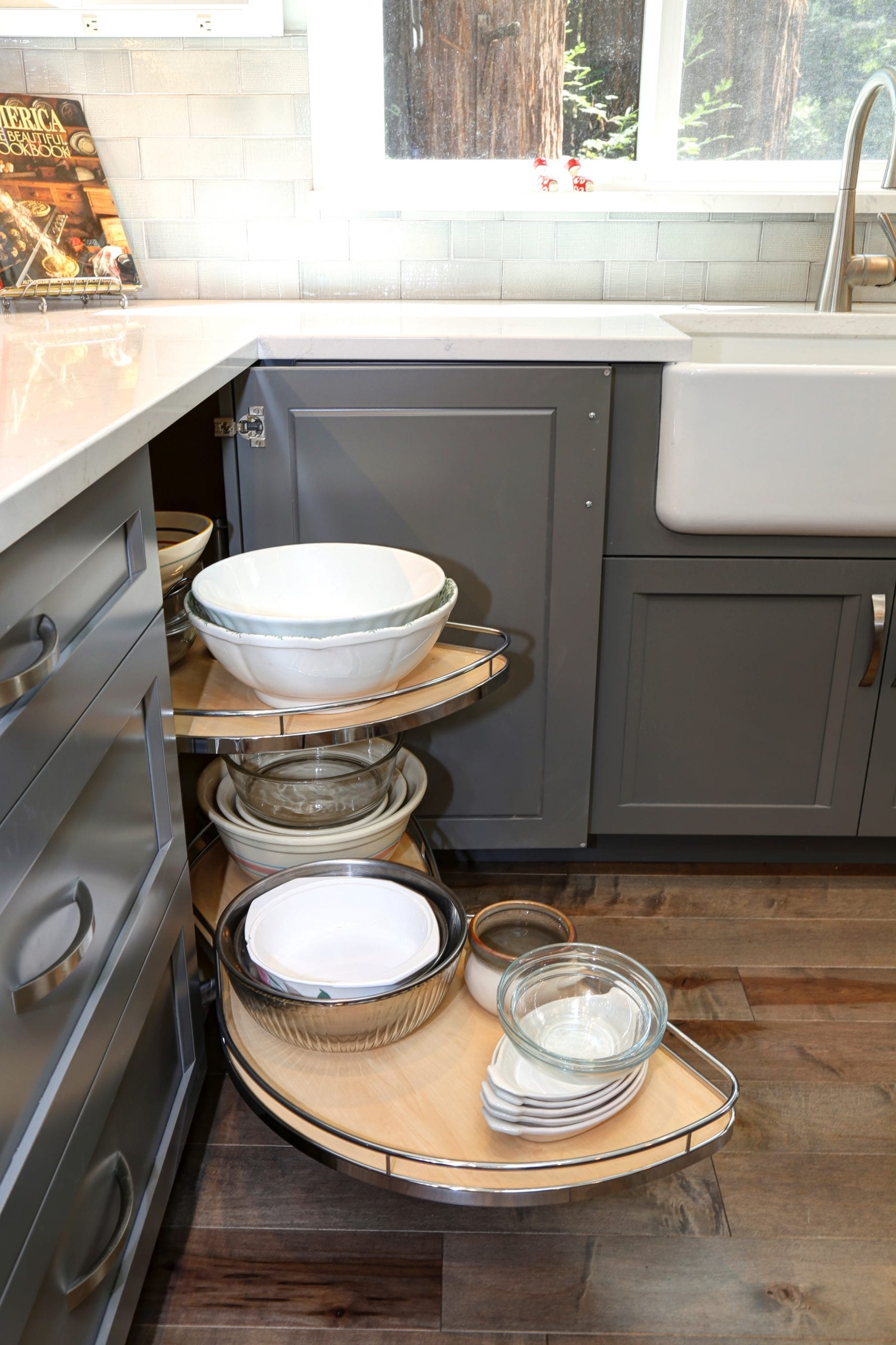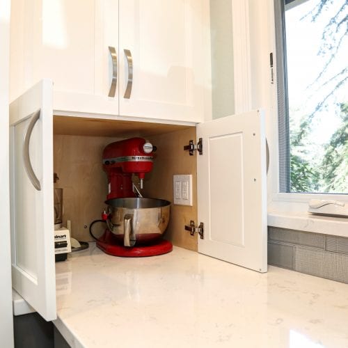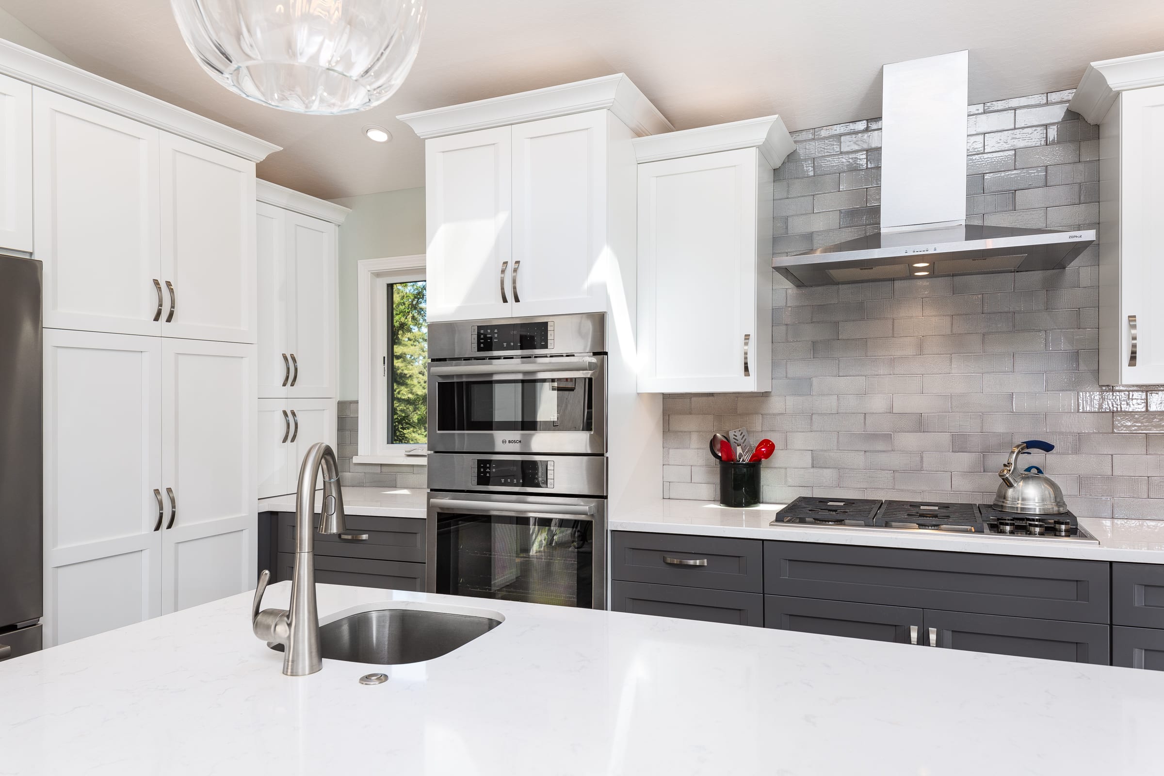 From a small, dark, U-shaped room to a bright, beautiful, expansive space, this home in the Santa Cruz Mountains houses one of our most effortlessly elegant kitchens to date. In the center of the room sits a tastefully large island for food prep, socializing, and storage. The two-toned cabinets — pristine white and classy gray — add a sophisticated touch that brightens up the room, too. During the kitchen remodel, we made it a point that functionality was never compromised; the cabinets, just like the island, are both pretty and practical. And for the finishing touch; pendants over the kitchen island. With a kitchen this sparkly, shimmery, and elegant, spending time in it is truly a joy.