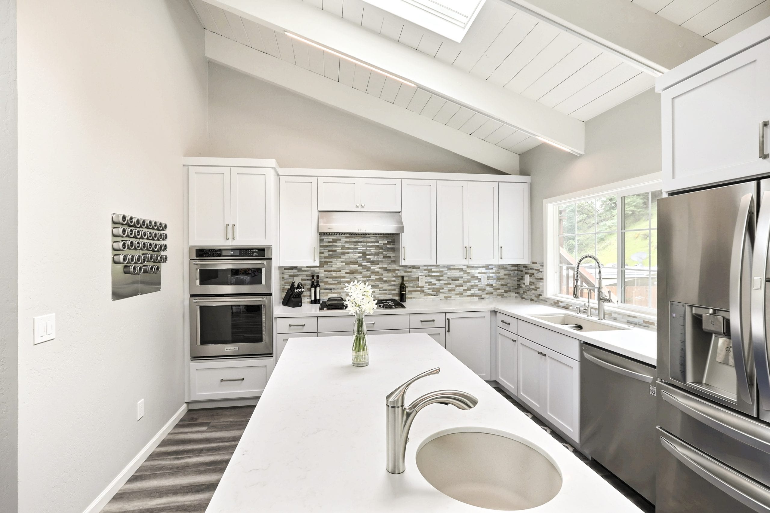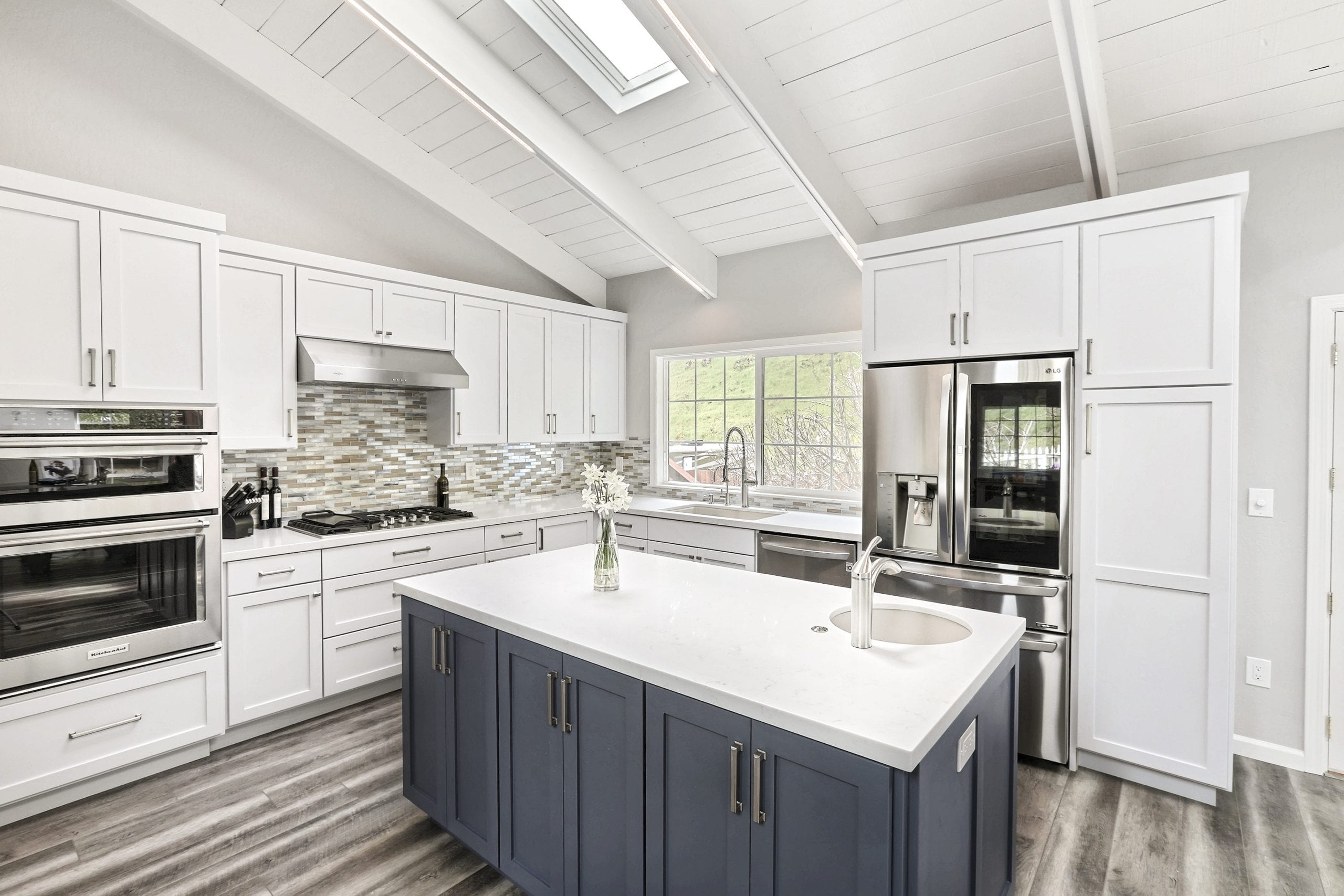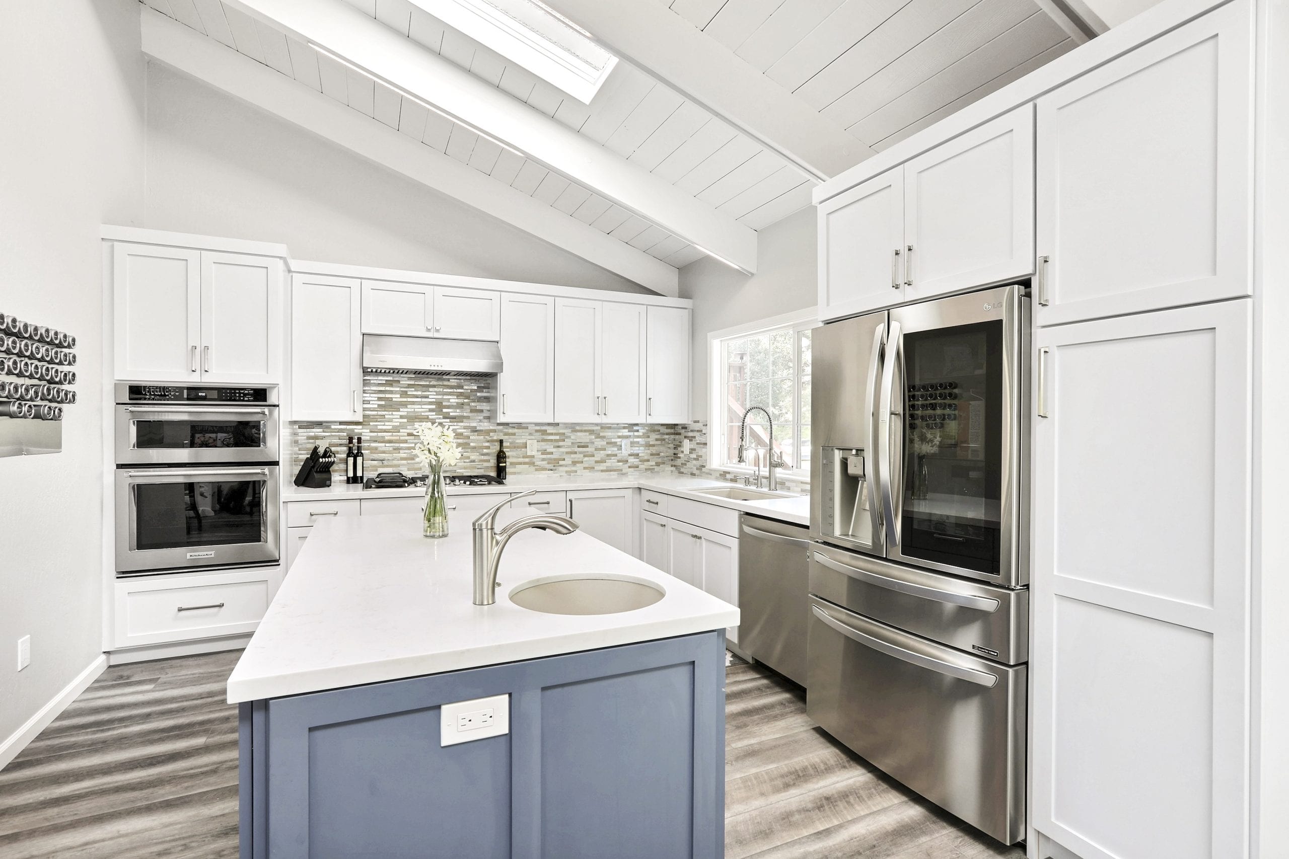 And to tie the whole thing together? Fresh new finishes. We positioned durable quartz countertops on soft gray and blue cabinets, all accented by a fun, multi-colored mosaic backsplash tile. Finally, new composite sinks and LED lighting installed in the existing ceiling beams made for an absolutely picture-perfect kitchen.