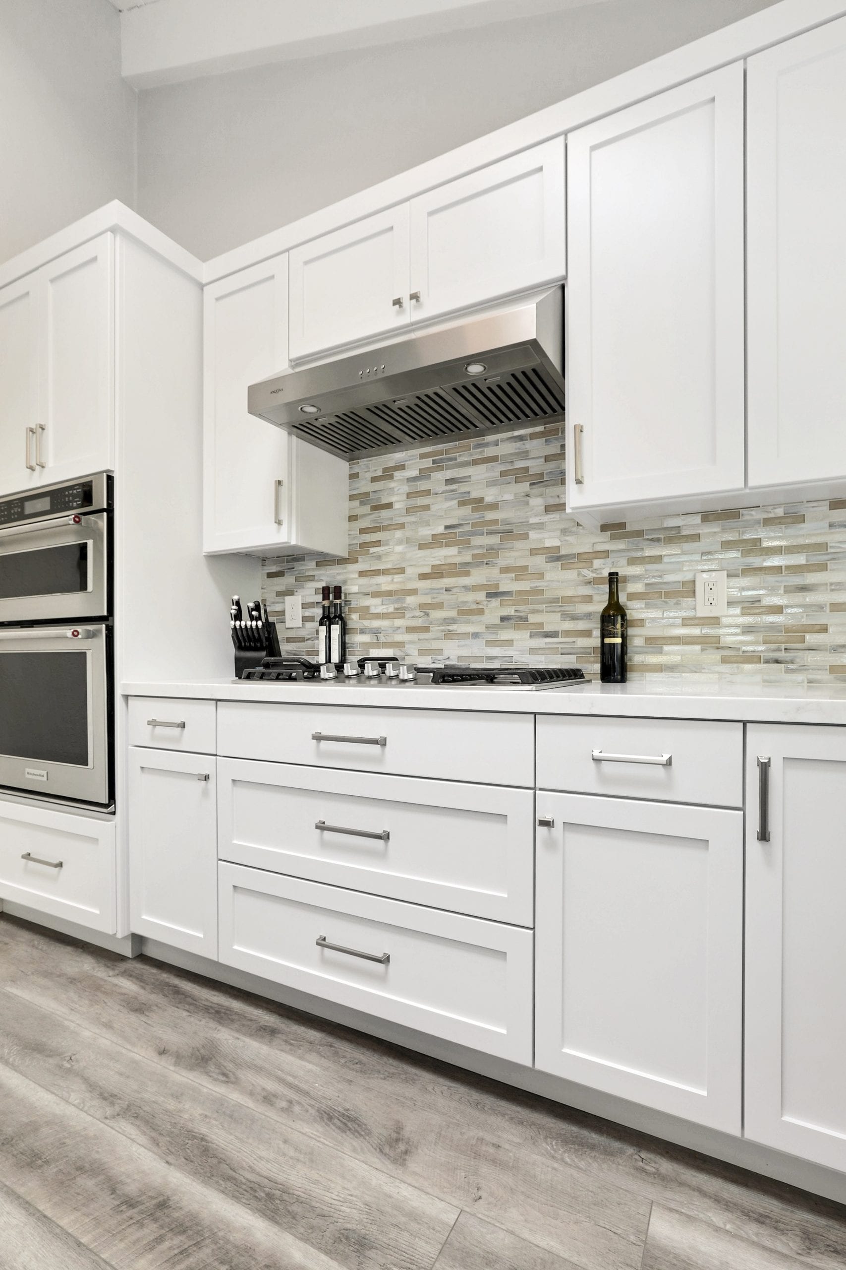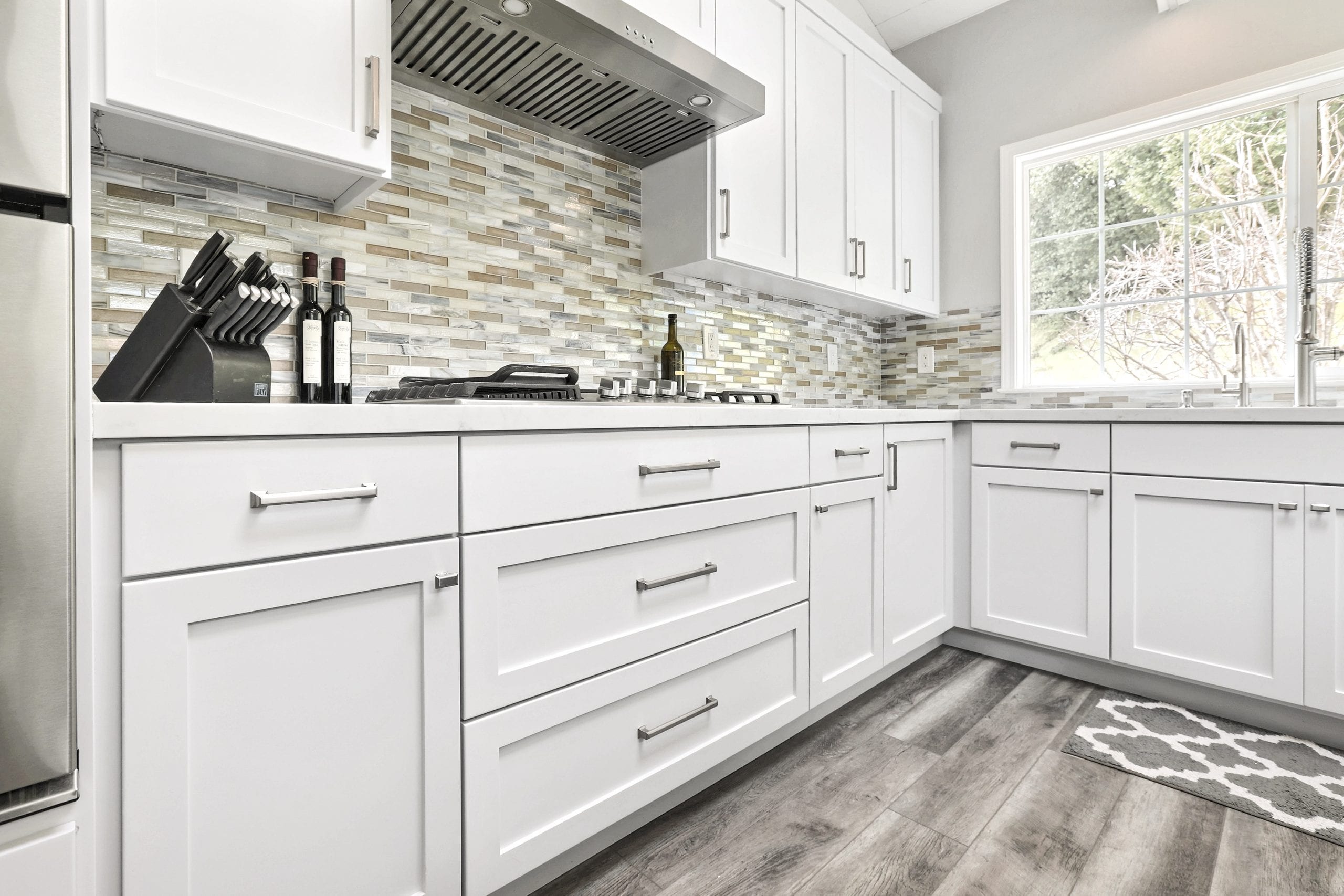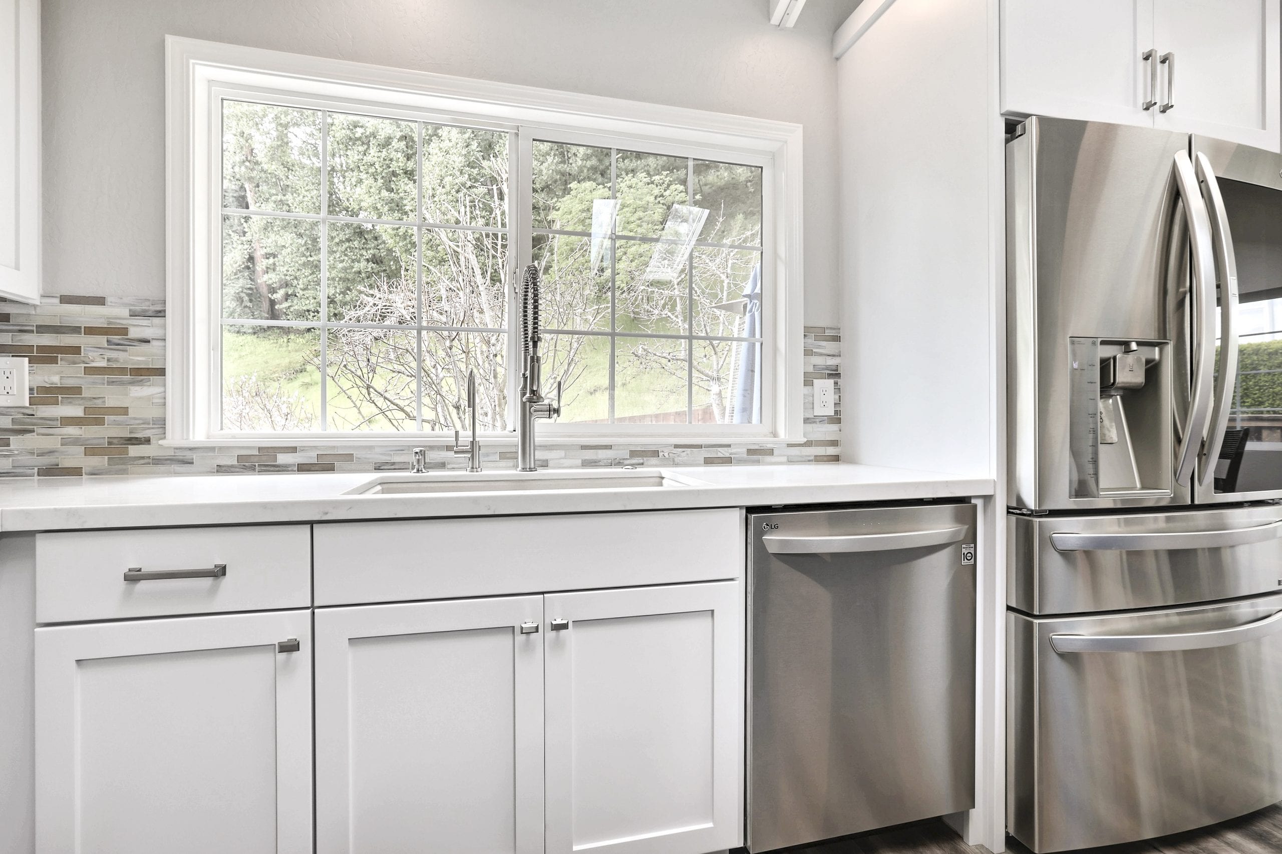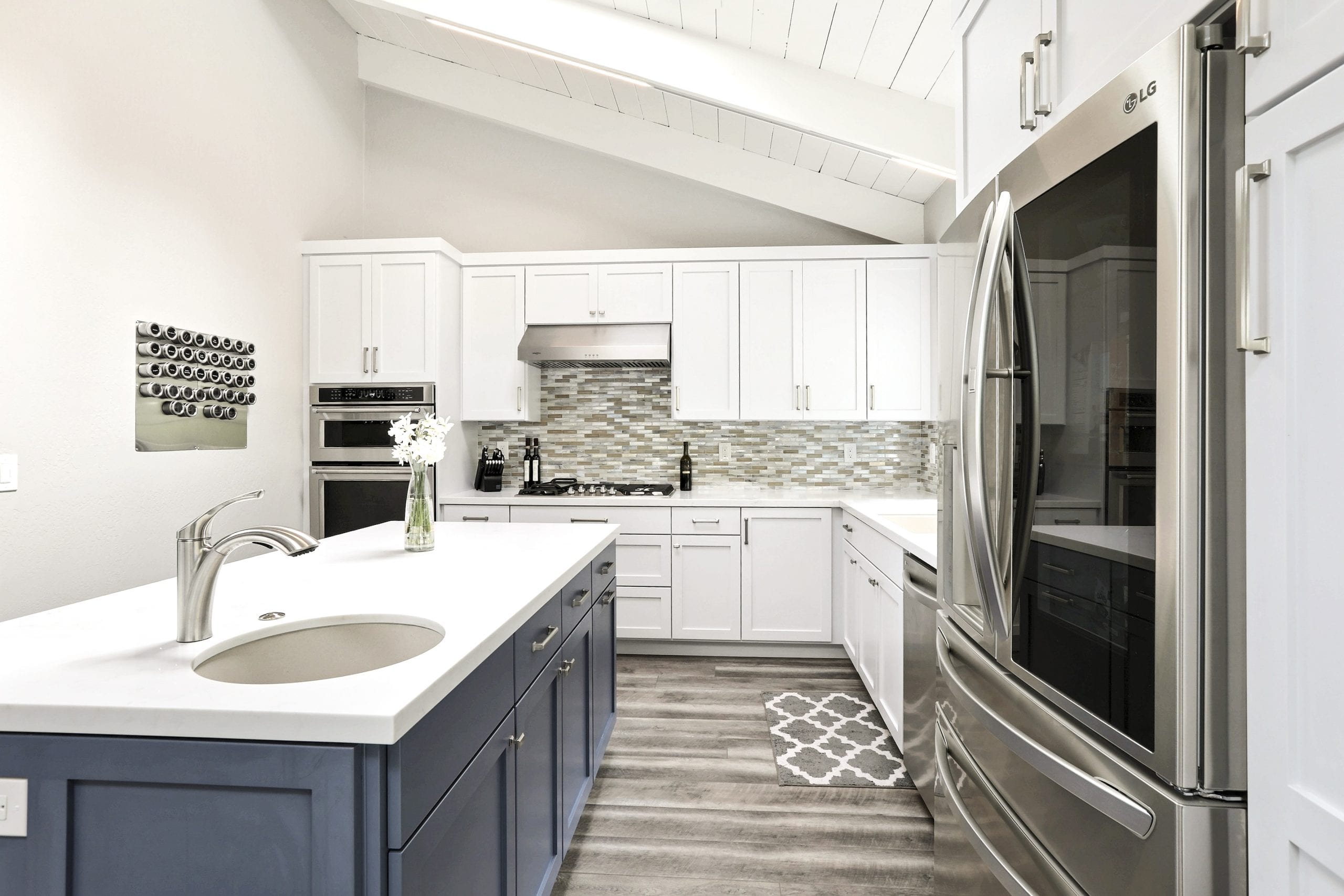 And to tie the whole thing together? Fresh new finishes. We positioned durable quartz countertops on soft gray and blue cabinets, all accented by a fun, multi-colored mosaic backsplash tile. Finally, new composite sinks and LED lighting installed in the existing ceiling beams made for an absolutely picture-perfect kitchen.