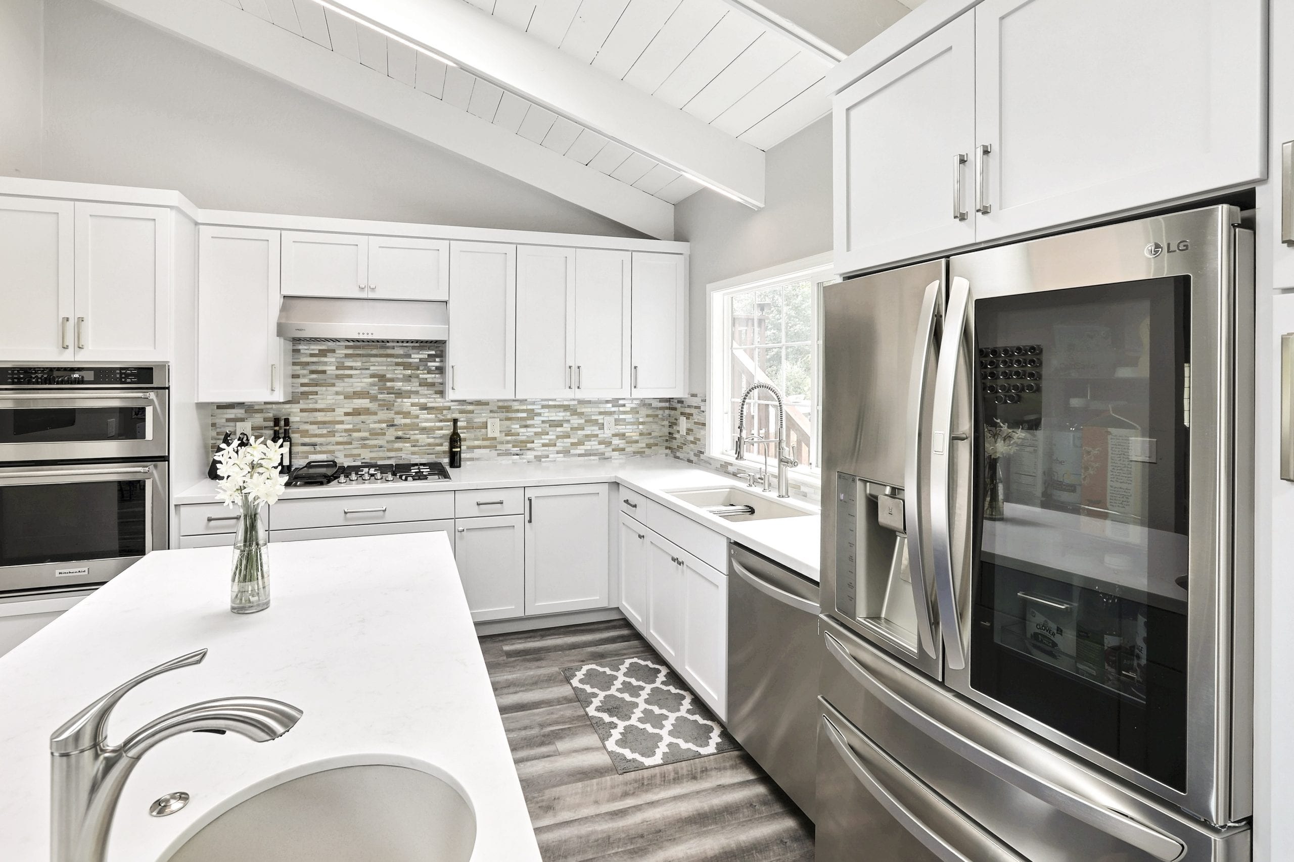 With great, natural lighting, plenty of square footage, and gorgeous tongue-and-groove vaulted ceilings, we knew we could create a kitchen that was just as amazing without having to change too much. This design provided plenty of open space for more than one cook to enjoy. We even included a social gathering area!
