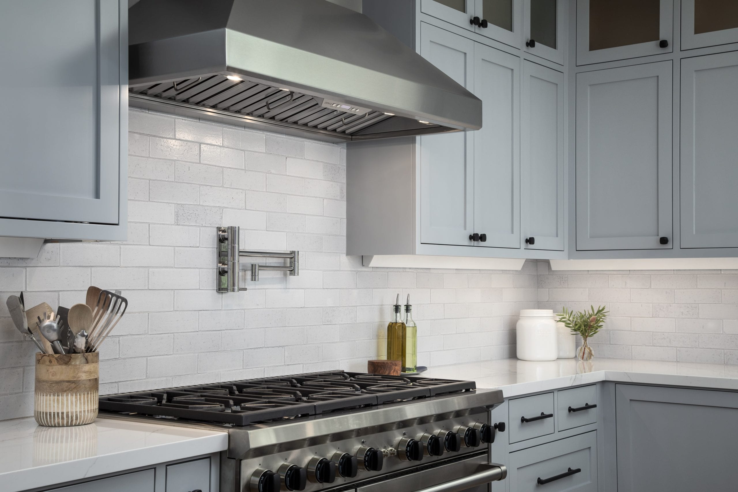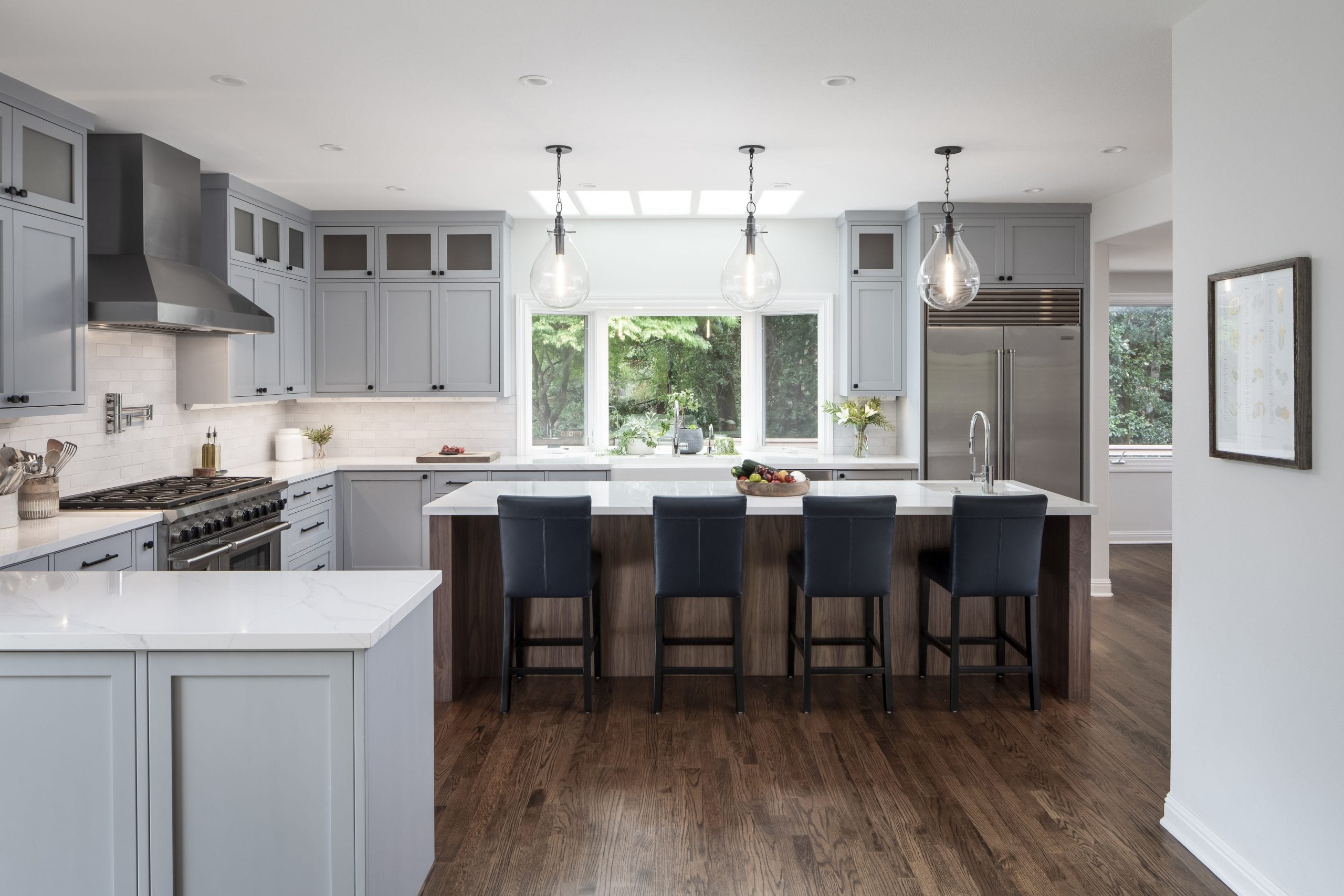 This elegant kitchen is the perfect space to prepare a morning coffee or entertain for a dinner party. By removing a common wall separating the kitchen from the dining room, this new open space creates both function and efficiency!