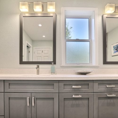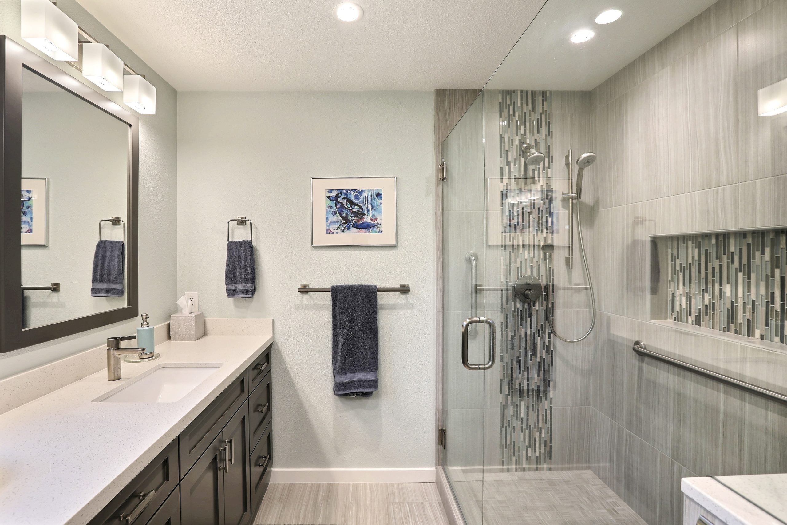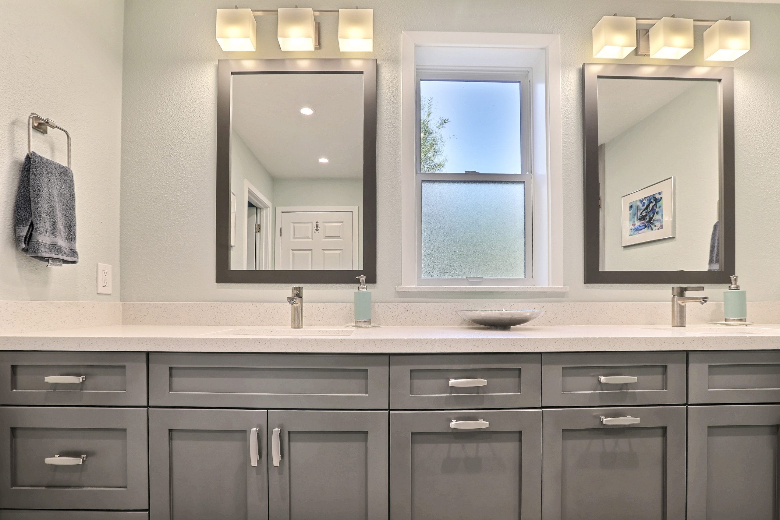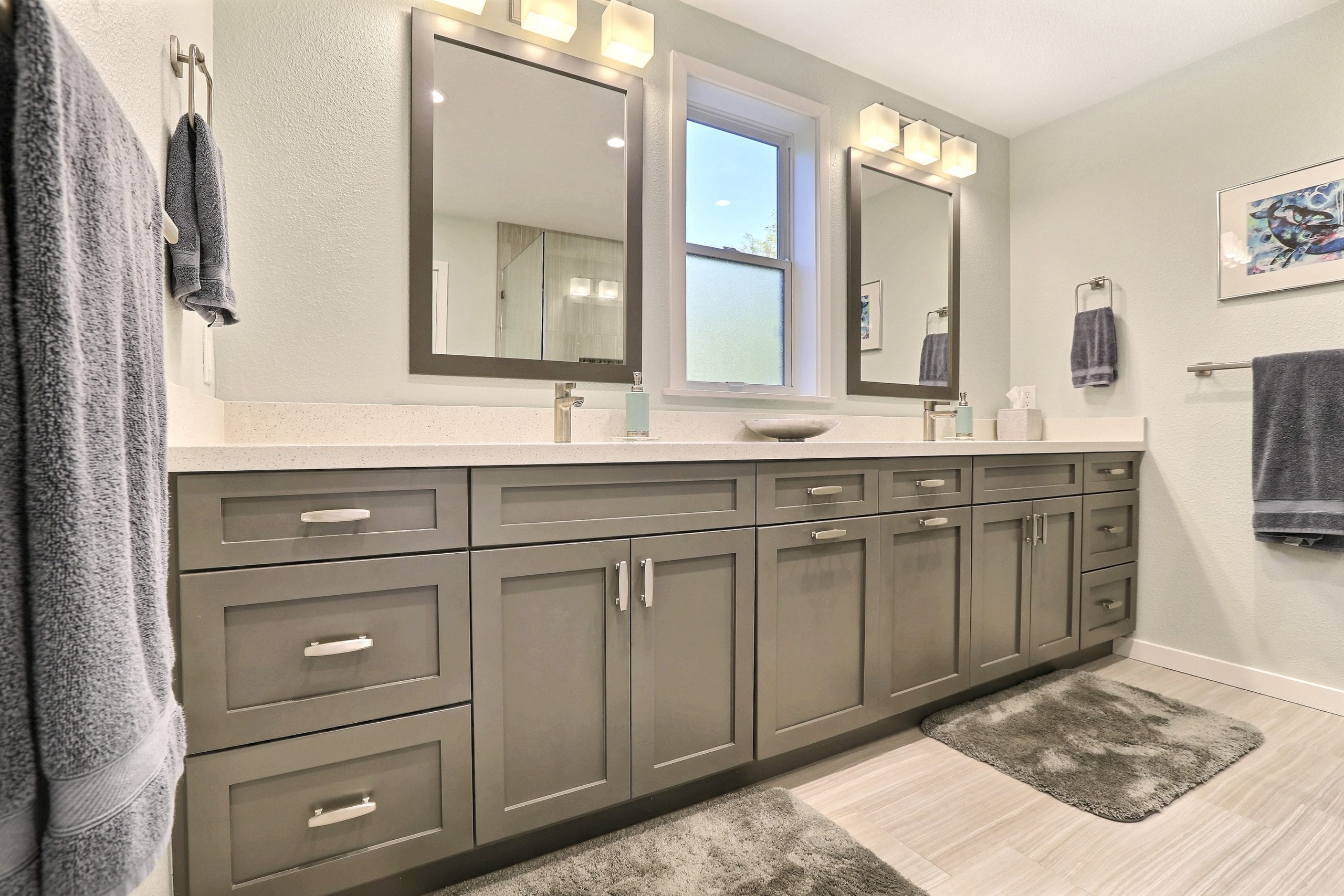 This property had been a rental for a while, until the previous tenants were finally ready to move in full-time and make this house their home! The original kitchen had a ‘U-shaped’ layout that felt closed off from the other rooms. By removing a couple of walls (and getting some structural engineering done), we were able to utilize the existing square footage to create a more open layout with a large center island. The kitchen cabinets are a gorgeous blue-and-white model paired with concrete look-a-like quartz countertops and white subway tiles for a casual, classic look. We also updated the flooring, redesigned the master bath, and revamped the closet to provide a much more functional (and updated) aesthetic.