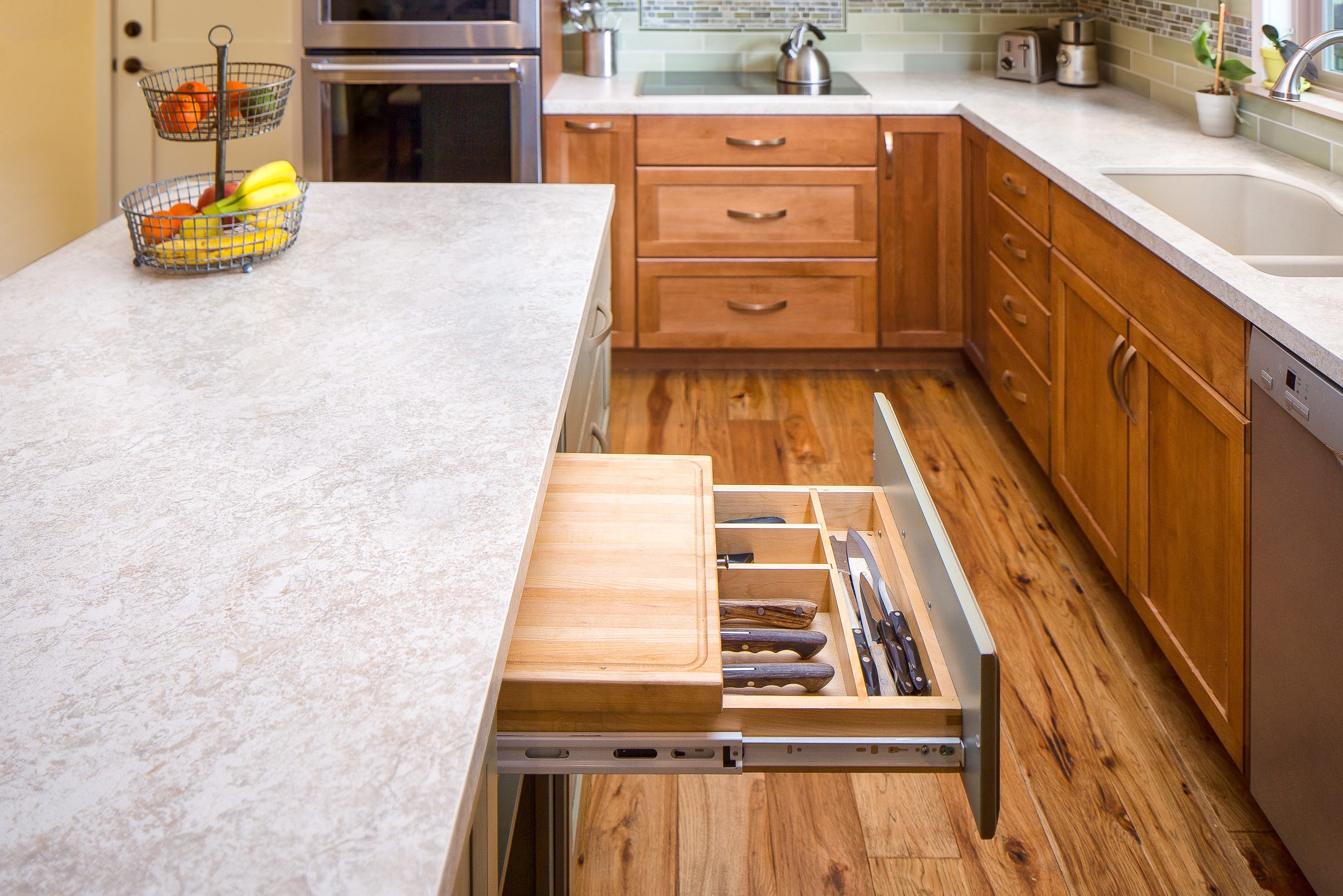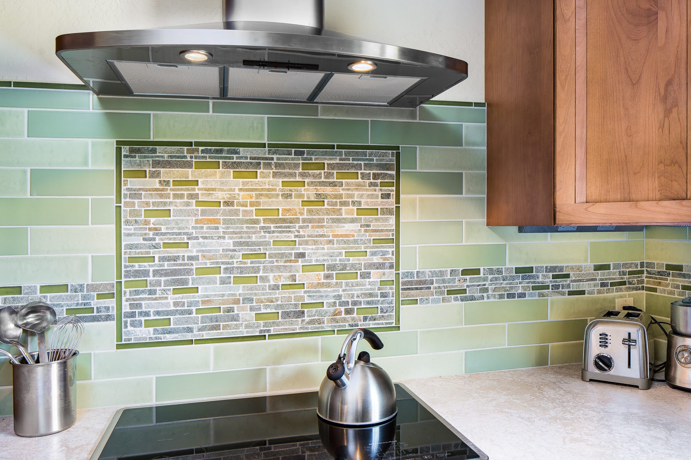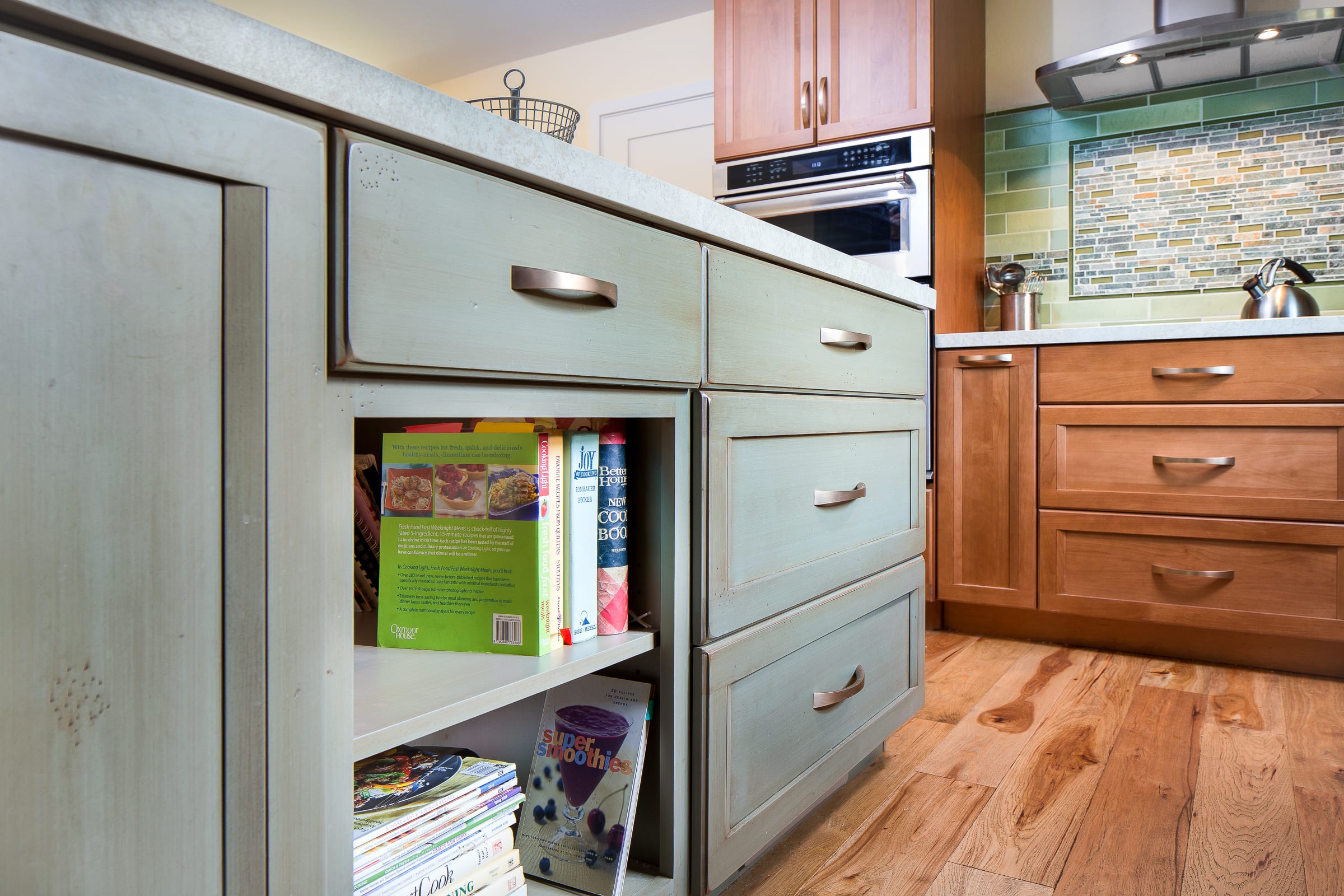 Other notable touches: the distressing and glazing on the island cabinets, the unique glass-and-slate backsplash, and the custom pendant lights that tie the room together. Truly delightful!