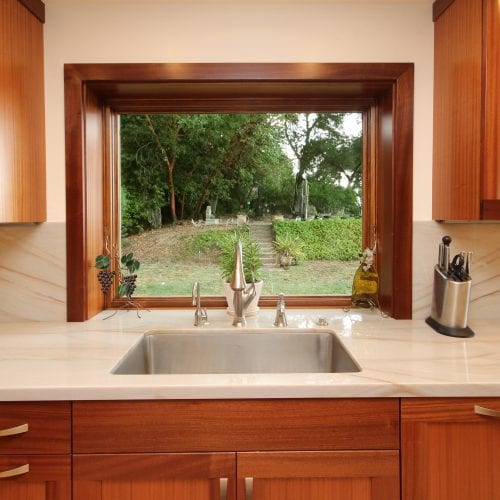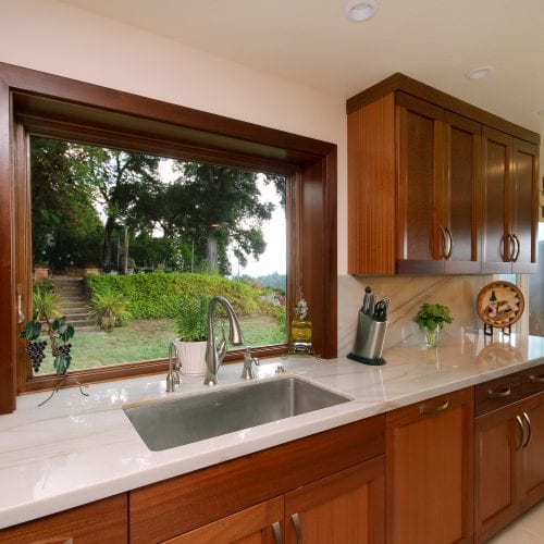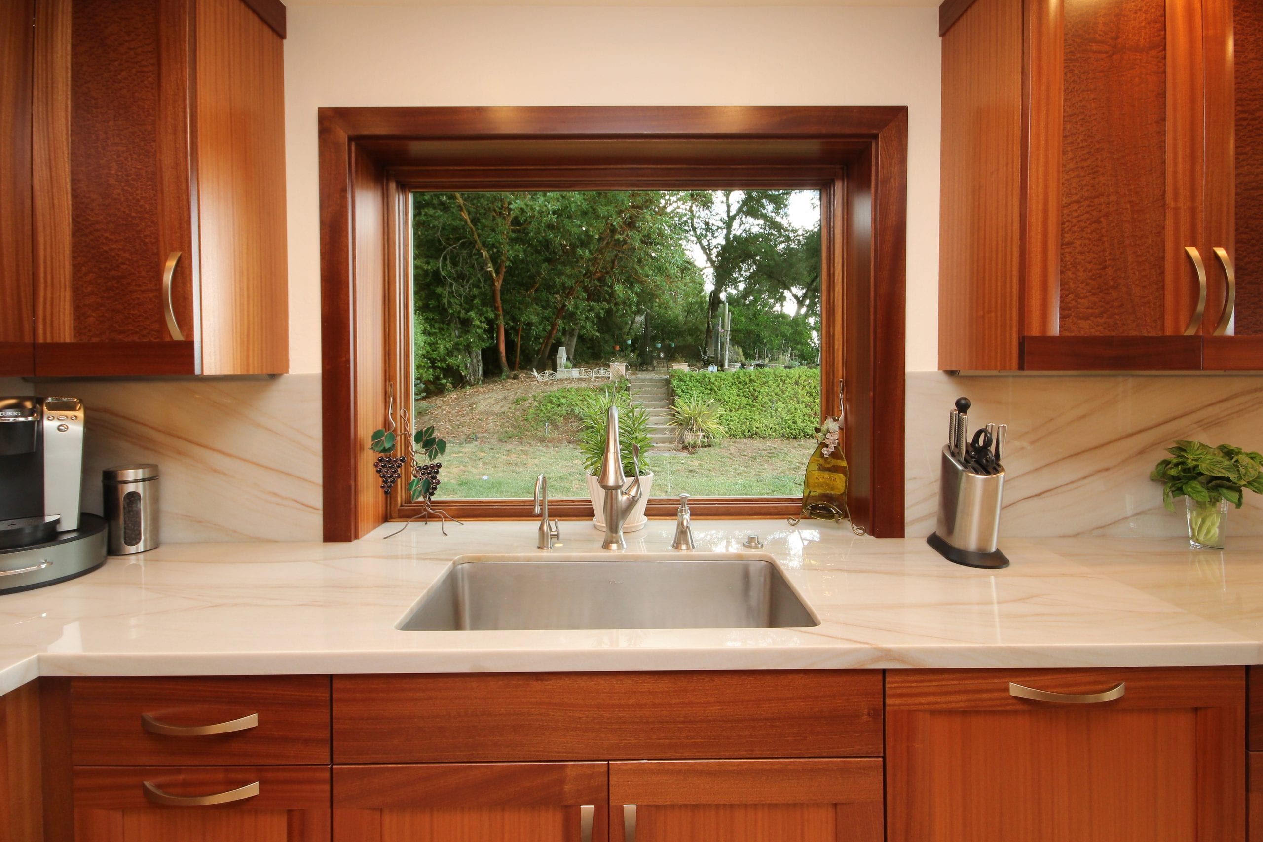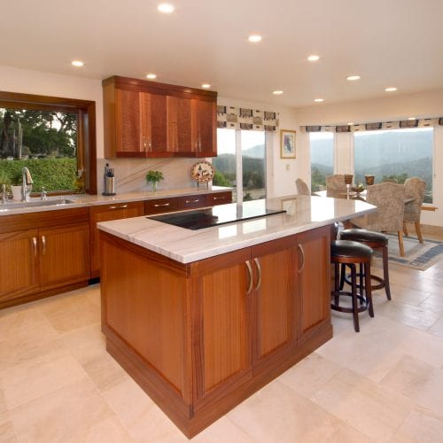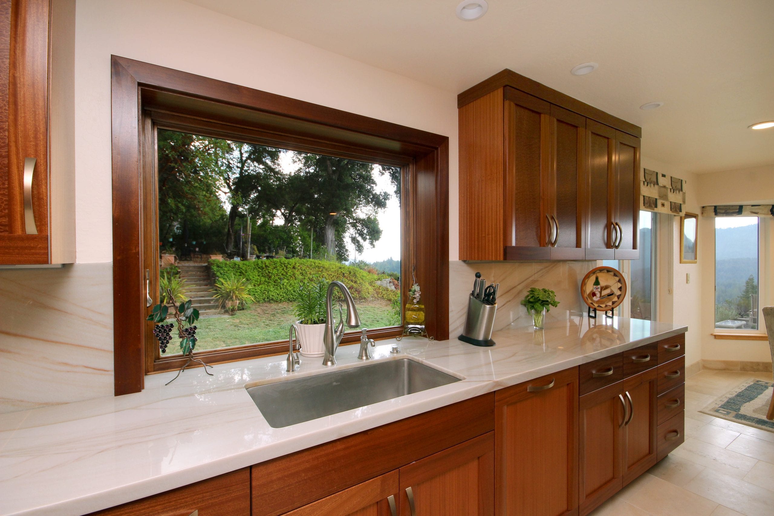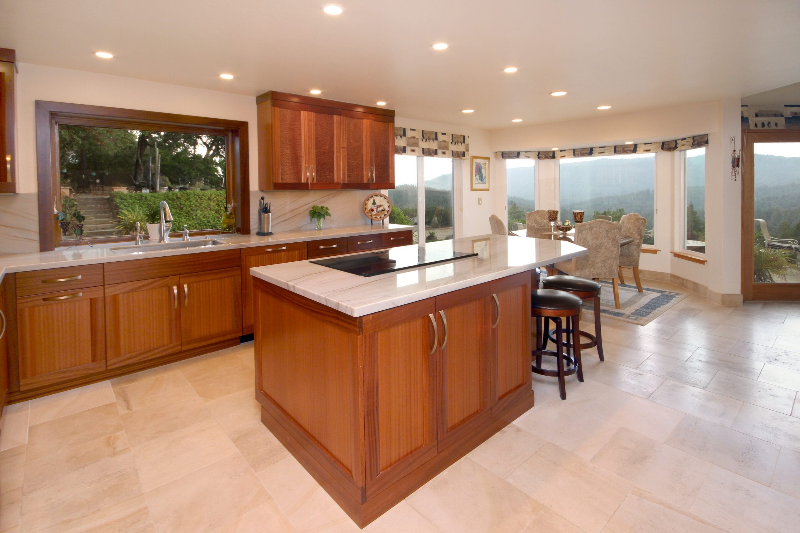 Located in the Santa Cruz Mountains, this kitchen had the potential for fresh air and beautiful ridge-top views. However, it was closed off from the stunning views by upper cabinets hanging over a peninsula. So, this kitchen remodel was all about opening up the available space. We added a lovely kitchen island and used stunning, high-end materials for finishes and touches. The awning window behind the sink can be opened for airflow. Bonus; it looks like a picture window—making for a more charmingly rustic view. Now the chef feels like she’s part of the action, inside and out!