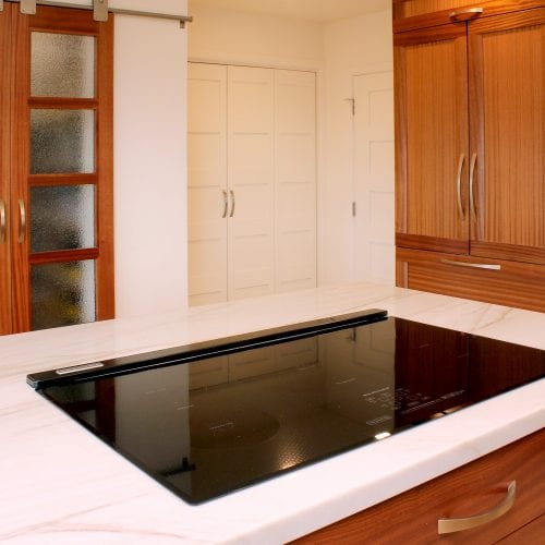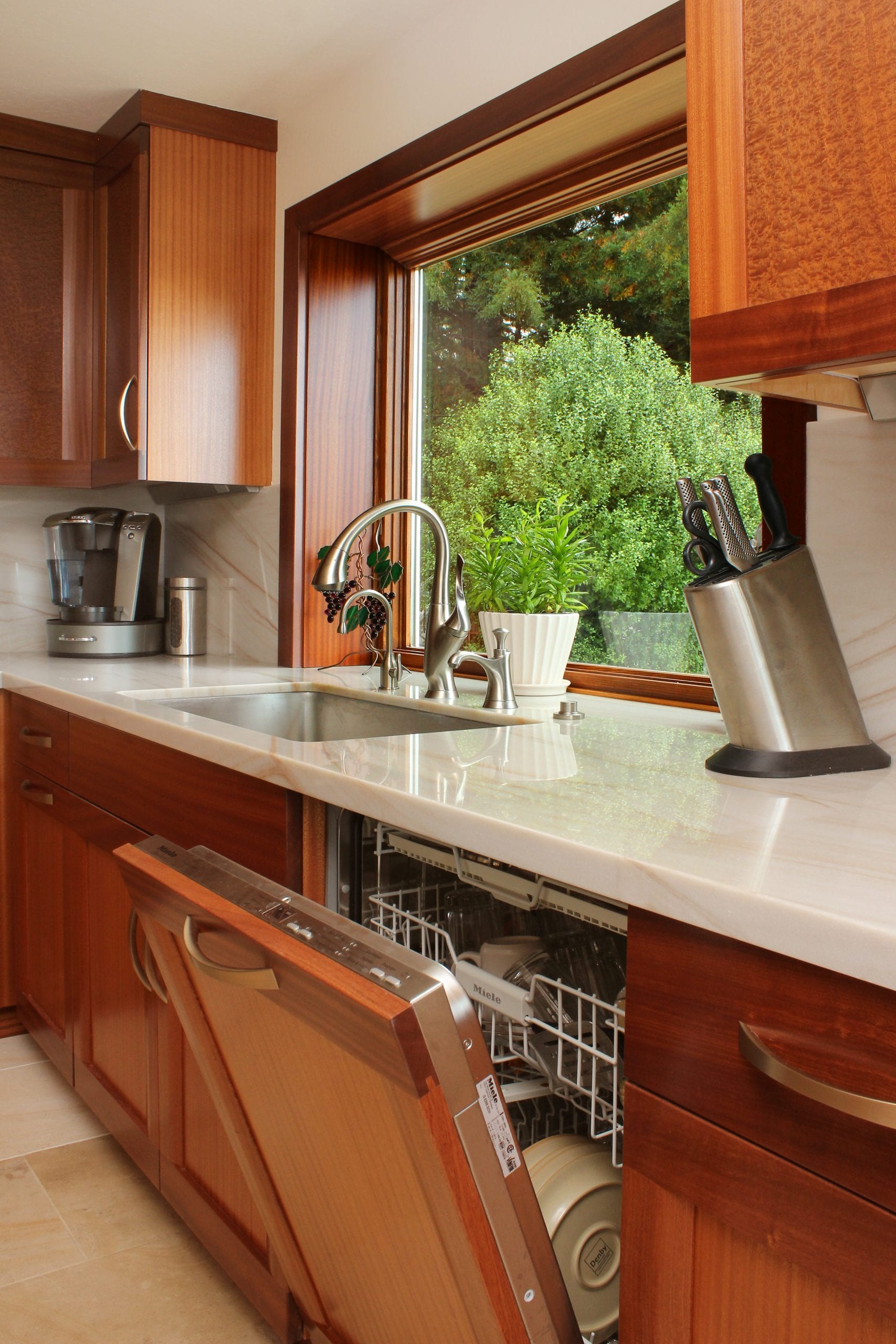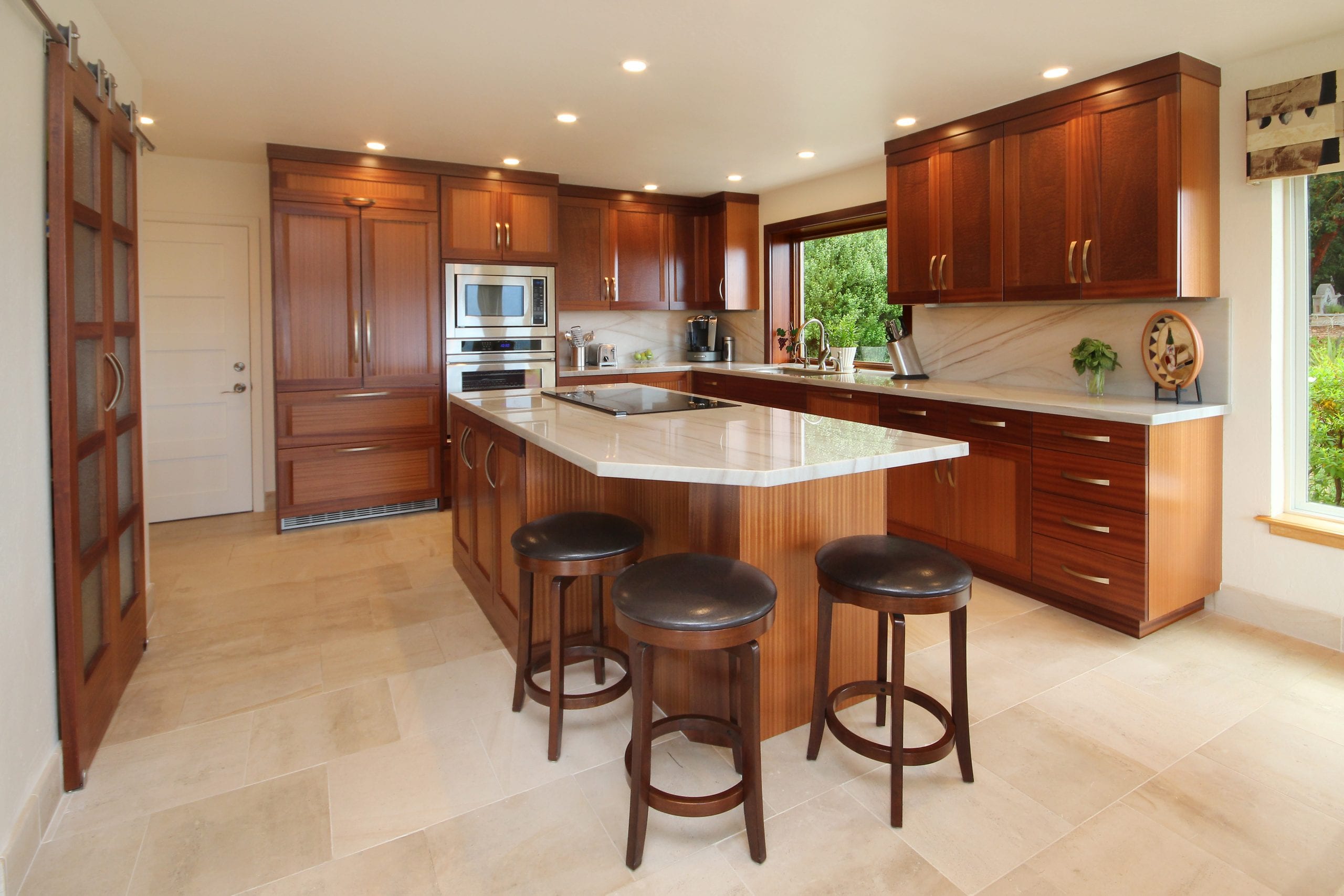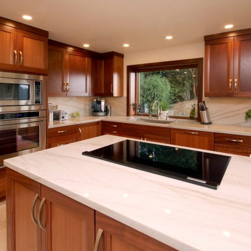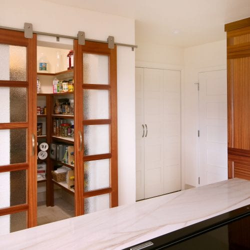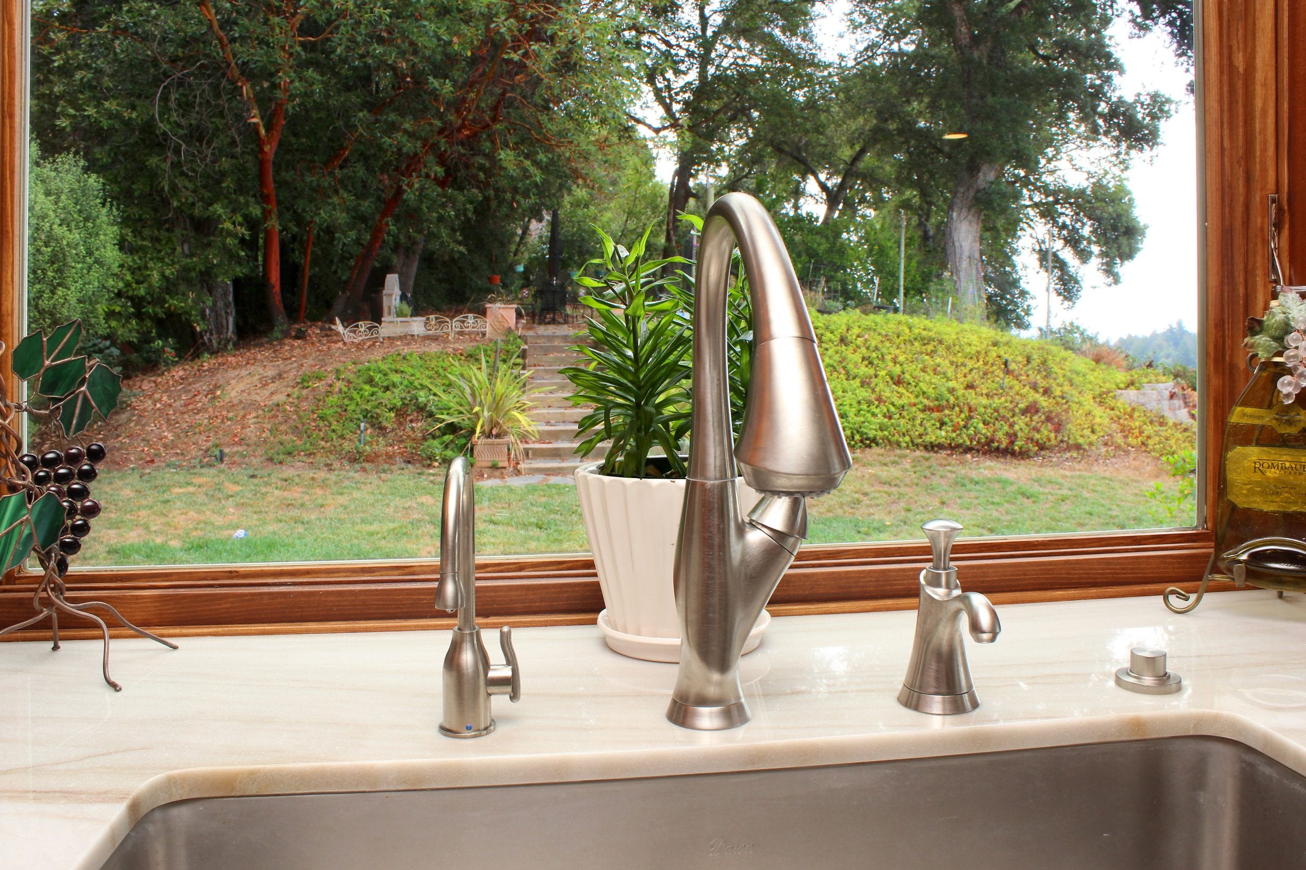 Located in the Santa Cruz Mountains, this kitchen had the potential for fresh air and beautiful ridge-top views. However, it was closed off from the stunning views by upper cabinets hanging over a peninsula. So, this kitchen remodel was all about opening up the available space. We added a lovely kitchen island and used stunning, high-end materials for finishes and touches. The awning window behind the sink can be opened for airflow. Bonus; it looks like a picture window—making for a more charmingly rustic view. Now the chef feels like she’s part of the action, inside and out!